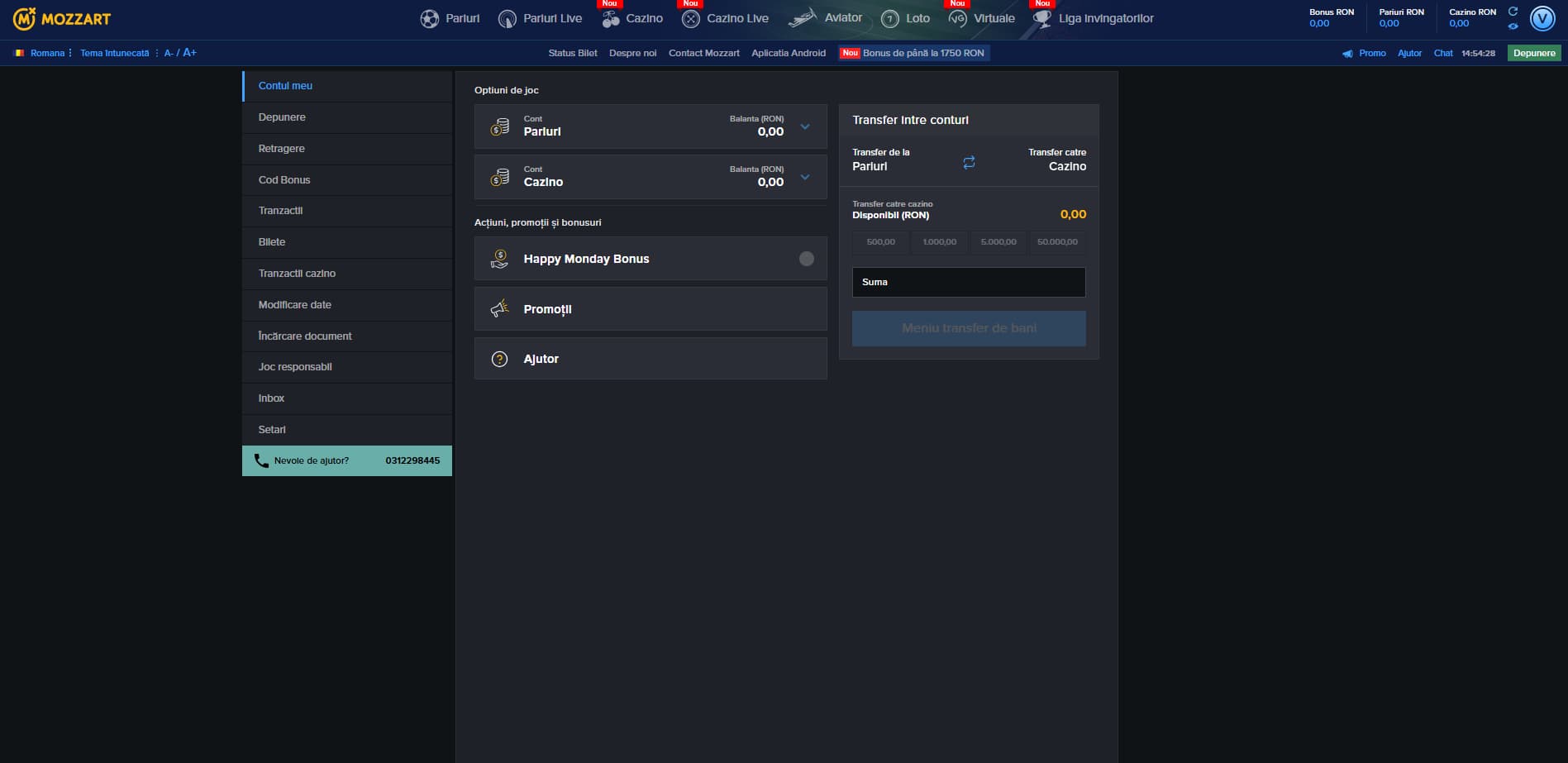 Dacă alegi depunerea cu portofelele electronice, cum este plata Skrill casino, atunci suma minimă depusă trebuie să fie de 45 RON. Retragerile se pot face doar prin intermediul cărților de credit sau în agențiile de pariere Mozzart. Câștigurile pot fi transferate numai în același cont de plată din care au provenit fondurile transferate de acesta către contul de joc.