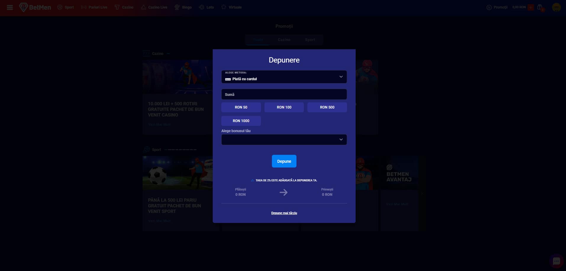 Apasă pe butonul de depunere, iar apoi completează pașii conform metodei alese.